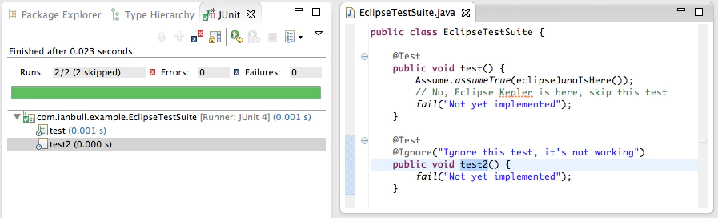 Finally, JUnit has received a few improvements especially how how it handles skipped tests. Skipped tests are decorated with a special icon and not marked as ‘passed’.